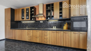 moderná kuchynská linka v drevenom dekore, čierny kamenný obklad, výstup na terasu a krásny výhľad do záhrady. veľká obývačka s galériou